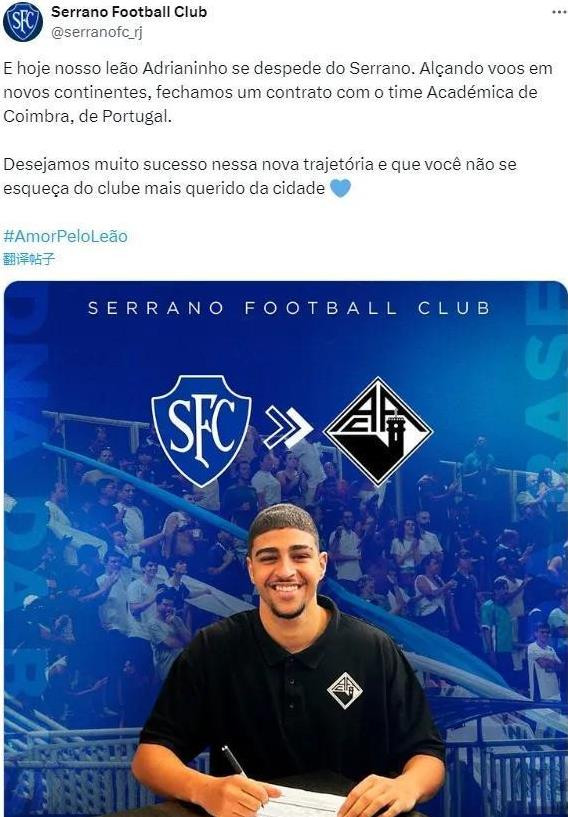 小阿德里亚诺加盟葡萄牙球队官方宣布,葡萄牙第三级别联赛球队科英布拉大学SF正式签下巴西传奇球星阿德里亚诺之子——阿德里亚诺·卡瓦略。这位18岁的小将,与父亲一样,司职前锋。2021年,他在巴甲劲旅格雷米奥的青训营中崭露头角,加入了U15梯队。两年后,他转战里约州腹地的佩德罗波利斯,效力于塞哈诺俱乐部的U17队伍。如今,小阿德里亚诺在2024年不仅晋升为塞哈诺一线队的一员,还获得了宝贵的出场机会。他的足球之路,正如那初升的朝阳,虽稚嫩却充满希望。